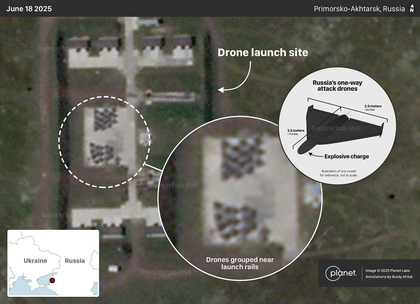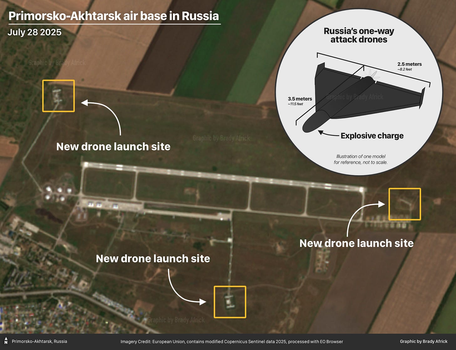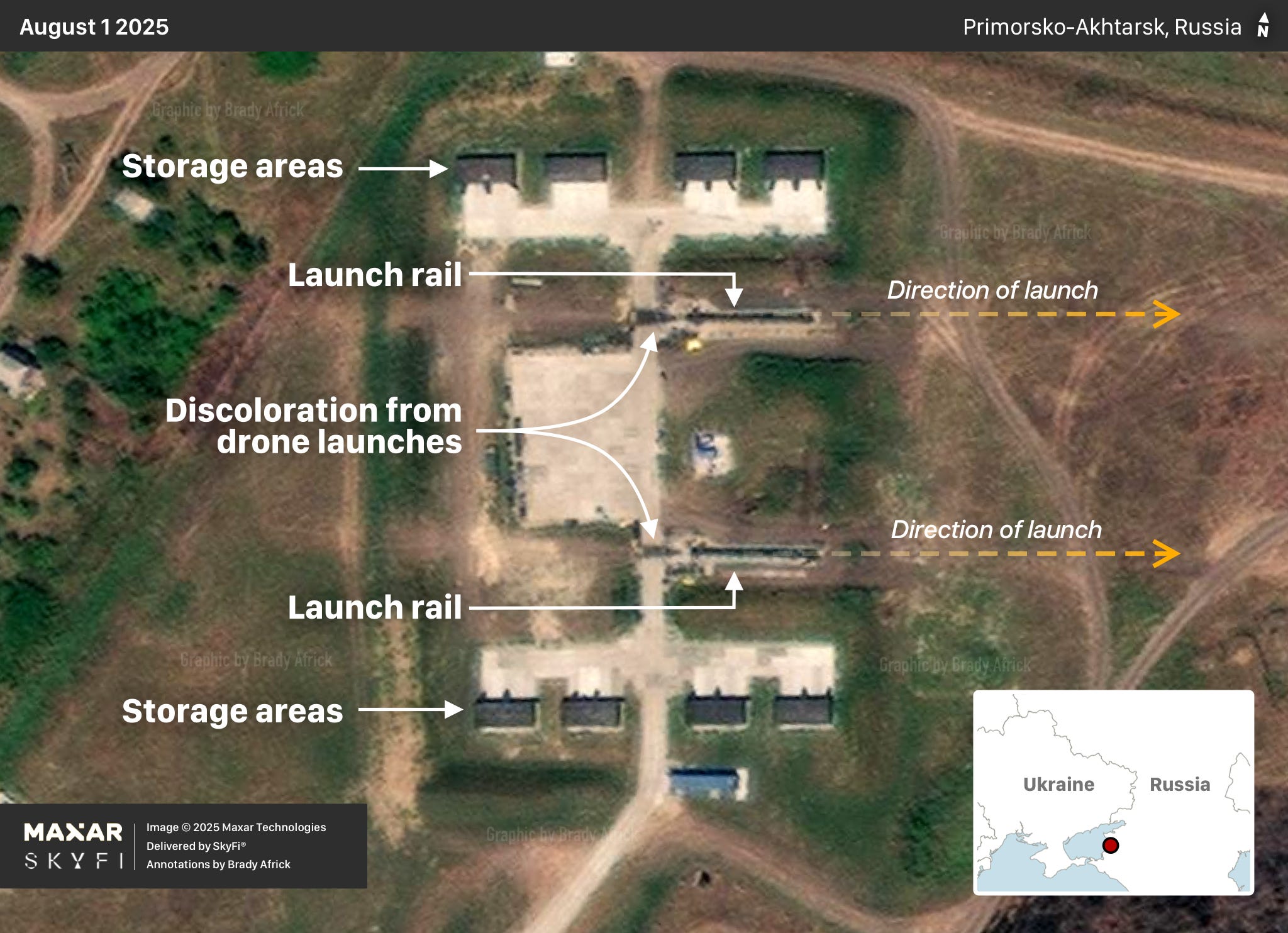 Satellite imagery of the base shows new storage areas and launch rails, which the drones use for takeoff. Russia’s drones can launch with the help of a rocket booster, moving trucks, or catapults.