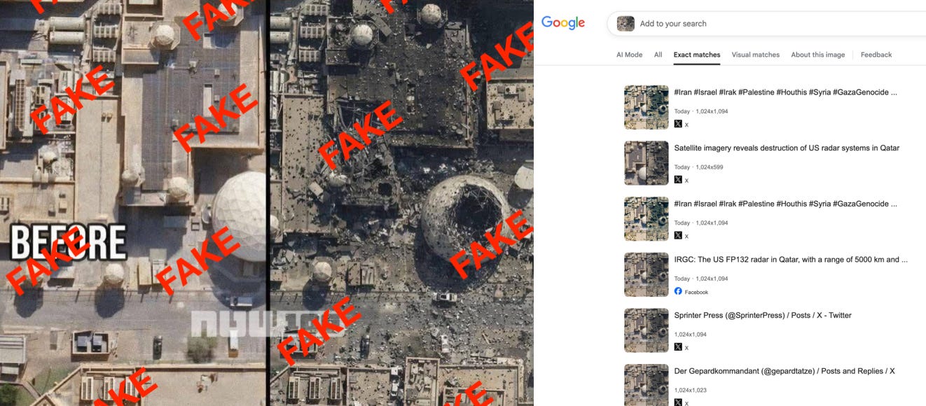 Misinformation spiked over the weekend, and satellite imagery was not immune. The first AI-generated satellite image that I came across purported to be a before-and-after comparison of damage to a US naval facility in Bahrain from an Iranian strike. But it had no visible credit to an imagery provider and showed the tell-tale signs of AI generation: impossible angles and hallucinated details not present in real imagery of the site. When I reverse-searched the fake image, I found it had already spread across social media like a virus, with dozens of posts across various social networks.